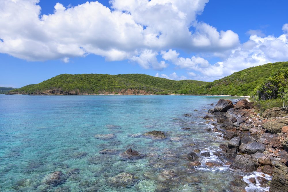 Clear turquoise blue water and rocky shoreline becoming sandy beach in the distance at Punta Soldado Beach on Puerto Rico island of Isla Culebra